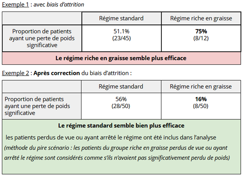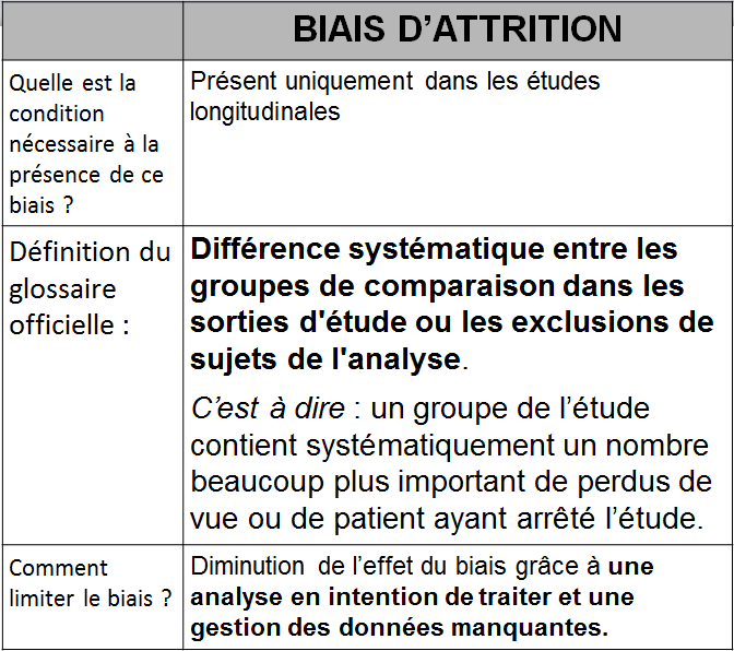 Il est possible de limiter le biais d’attrition en réduisant au maximum le nombre de perdus de vue et en effectuant une analyse en intention de traiter : tous les patients randomisés sont inclus dans l’analyse des données.